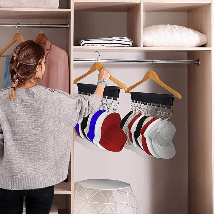 Utilisation simple : accrochez-le dans un placard ou sur une barre. Placez vos casquettes sur les crochets métalliques.